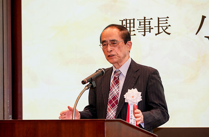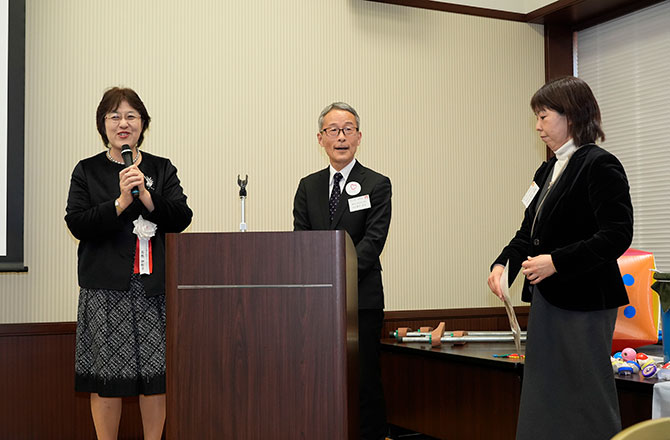 弊財団小野理事長の挨拶の後、来賓を代表して、文部科学省総合教育政策局 社会教育振興総括官の神山弘様よりご祝辞をいただきました。続いて、こころを育む総合フォーラム座長の鷲田清一様より受賞団体に賞状と記念の盾が渡され、受賞団体から一言ずつコメントをいただきました。最後に、鷲田清一様より祝辞をいただきました。
