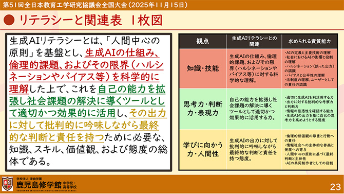 次なる課題は,生徒と生成AIのよき関係を組織的に展開することであろう。鹿児島修学館中高等学校は国際バカロレア校であり,それゆえATLスキルの育成を柱とする教育課程が編成されている。それらと生成AI利用のスキルやモラルとの関係を整理すること,換言すれば,鹿児島修学館中高等学校としての生成AI利用のカリキュラム(学年・教科・単元等)を開発することが望まれる。学校の報告によれば,すでにその構想は生まれているので,ぜひ今年度中に形にしていただきたい。もちろん生成AIの利用は,日々,変化を遂げている。今や小学校においても,子どもたちがそれを利用している。そのため,生成AI利用のカリキュラムは,現状では暫定的なものにしかならないけれども,それでもなお,いったんその全体像を考えることは,次のステップに進むためには価値あることである。