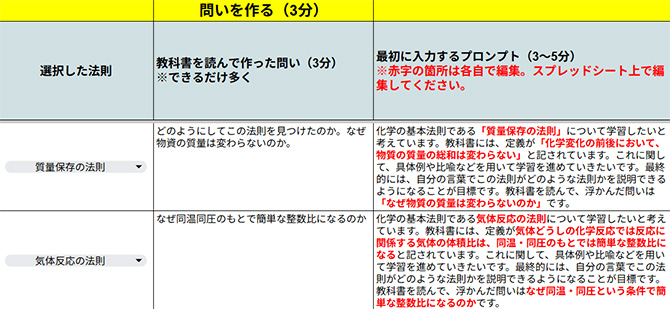 • ・教科書を開いて興味のある法則を選び、問いを立ててスプレッドシートへ