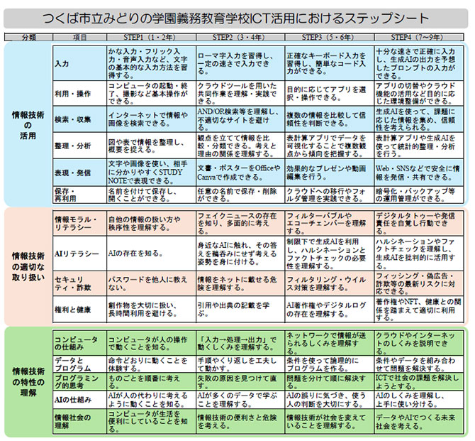 • 今回、ICT活用におけるステップシートが作成された。従来もこうした取組が本学園においてもあったと思われるが、生成AIなど時代に合わせて、最新の記述となっている。今後も児童生徒の実態や時代に合わせて加筆修正され、指導法も含めて、さらにブラッシュアップされていくことと思われる。記述された一つひとつをしっかりと身に付ける事も重要である。さらに、それぞれの活動が自然と児童生徒の発案で実施できること、目的をもって各活動がつながりをもって自然とできるようになるために、どのように指導していくかは永遠の課題になるだろう。