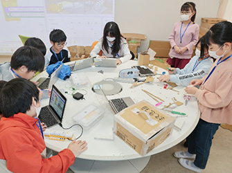 本時の学習目標は、活動グループごとに、自助・共助・公助の視点から災害対策としてできることを考える学習場面を設定し、自分たちにできることを選択・判断することである。学園生は、自助(避難グッズの作成)、共助(避難掲示の作成や避難所の制作)、公助(救助用ロボットの作成)といった活動例の中から、解決したい課題に応じて活動を選択し取り組む姿が見られた。活動では、プログラミングや工作、スタディノートなどが活用しながら、様々な表現の工夫が見られた。活動報告はTeamsのクラウド機能を活用して共有され、リアルタイムで他グループからの助言を得たり、生成AIを用いて個に応じた学習の振り返りを行ったりすることで、次時に向けた課題を構築することができていた。