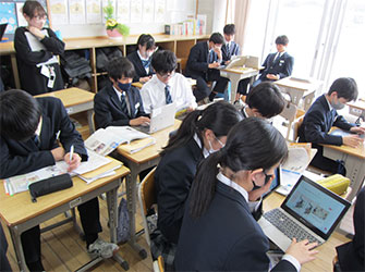 北海道地方について、「自然環境」「産業」「歴史」の視点から学習するために、「北海道修学旅行プランを提案しよう」という題材で調べ学習や話し合い活動を行った。ある班では、修学旅行プランを生成AIに提案させ、学習のベース作りを行い、教科書や資料集を用いてファクトチェックをする様子が見られた。学習効率を向上させるために学習する道具をうまく使い分けられていた。1つの事象を様々な視点から眺めたり、関連付けて考察したりする様子が見られた。