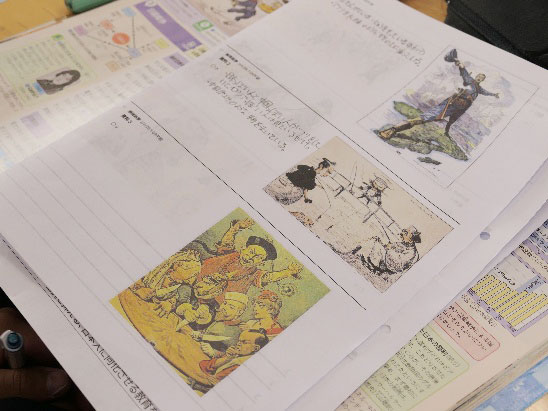 今回の授業では、場面設定を意識して課題を設定した。具体的には、「日本文化について知りたがっている3人のALTに向けてパンフレットを作成しよう」という課題にすることで、相手意識・目的意識が生まれ、主体的に課題に取り組めるようにした。パンフレットは、PowerPointの共同編集で作成することで、他者参照できるようにした。本時では、作成途中の紹介文をペアを変えながら見せ合い、アドバイスをもらった後、AI添削アプリや友人に尋ねながら、リライトするという授業展開にした。予想よりも、具体的なアドバイスを与えることが難しそうであったこと、一度書き終えたものを再度、書き直そうとする生徒が少なかったこと、などの反省があがった。